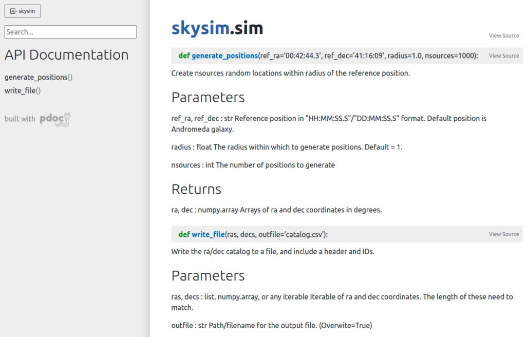 The simplest to use is the pdoc package which can be obtained from pypi.org. The packaged can be installed via pip install pdoc, and then run on our test module using pdoc skysim.